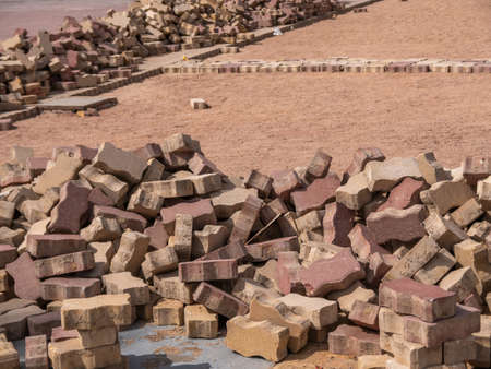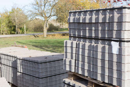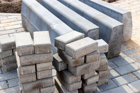 View of new paving slabs and concrete blocks on summer day at construction site. Stone blocks stand in stack. Repair of square and sidewalks. Restoration of road surface.