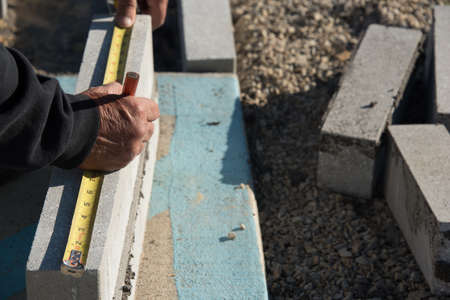 Builder measuring a gap for a new paving stone with a tape measure as he lays a new floor on a foundation of levelled sand with colored side vignette.