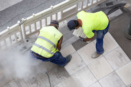 Decorative facing tiles for paths and buildings. Tiles for building cladding works on the streets of the city. Laying tiles on the road.Material for covering sidewalks and streets.Repair of sidewalks