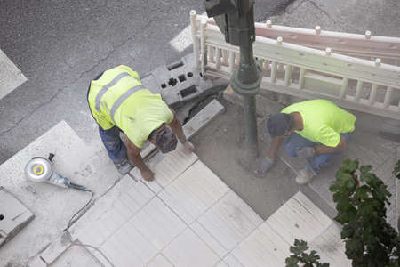 Construction workers installing and arranging precast concrete pavers stone for road at the construction site.