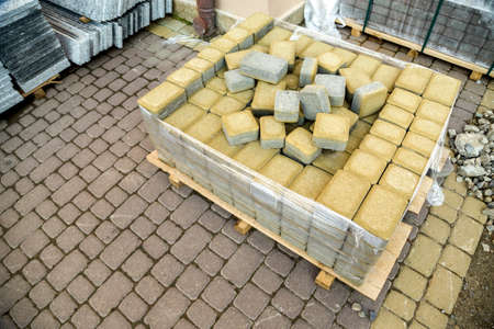 Pavement repair and laying of paving slabs on the walkway, stacked tile cubes on the background. Laying paving slabs in the pedestrian zone of the city, sand filling. Road tiles and curbs