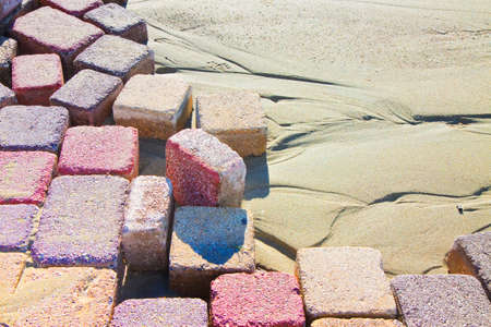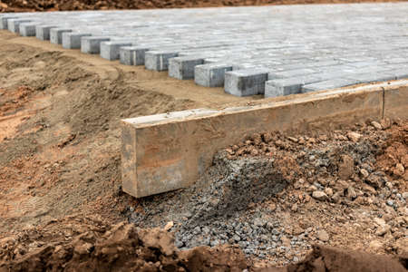 New colorful paving stones along a directional cordon on a prepared flat surface