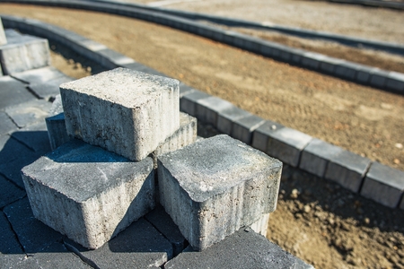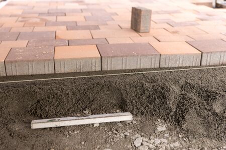 New paving bricks or stones with a rubber mallet on a sand foundation.
