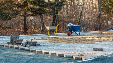 Construction site and paving on a walking path in a public park. Scene of preparatory work with carts for transportation of soil. Paving tiles in the process of laying