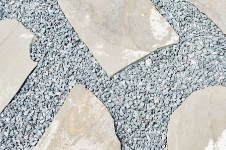 Top view of the edge of a surface with laid gray and yellow paving slabs. A surface with a sandy mixture is visible. It looks like a diagram. Background. Texture.