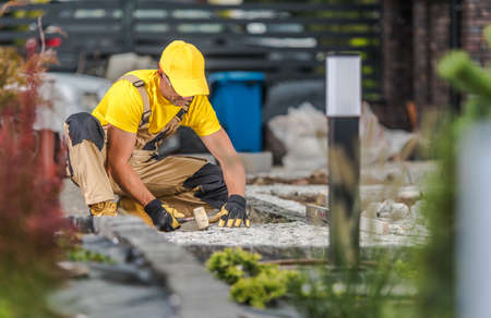 Caucasian Landscaping Worker in His 40s Building Backyard Garden Granite Bricks Path. Residential Landscaping Industry.