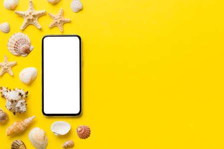 Flat lay composition with Phone and beach accessories on colored background. Smartphone with blank screen mock up with copy space.