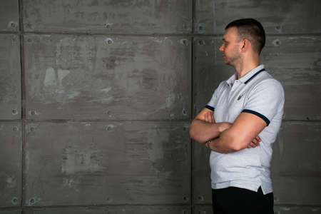 The young man has his arms crossed over his chest and is looking at the wall. A man stands in a loft-style room on a gray background. Stylish interior.
