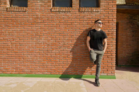 a young guy of Eastern appearance with black hair and a handsome expressive face poses in a Park against the background of trees and architecture. High quality photo