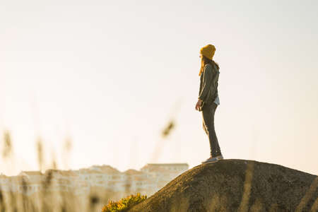 attractive man standing watching the sunset from a cliff by the sea, concept of leisure and relax, copy space for text