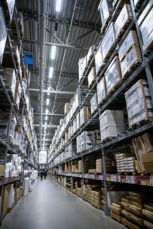 MEGA Moscow, Moscow - January 16, 2020: Warehouse aisle in an IKEA store. Founded in 1943, IKEA is the world's largest furniture retailer. IKEA operates 351 stores in 43 countries.