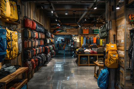 Small outdoor clothing and backpacks shop interior with warm lighting and wooden walls