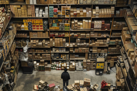 A man standing amidst stacked boxes in a warehouse, organizing inventory, A lone figure meticulously organizing inventory