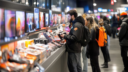 Young adults browsing the latest technology products in a busy electronic store, enjoying the vibrant atmosphere and exploring various devices.