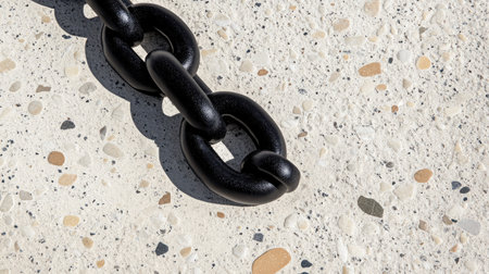 A close-up view of a black metal chain link resting on a light textured surface, showcasing the interplay of shadows and highlights in natural lighting.