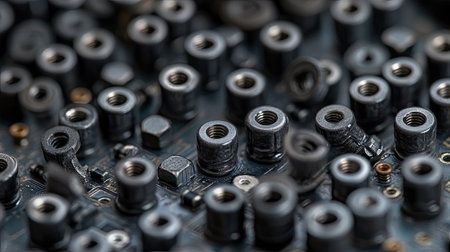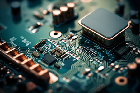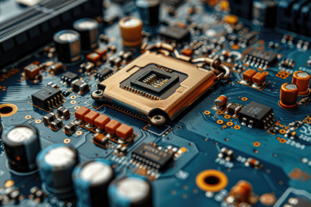 Macro image showcasing the intricate design of a motherboard with electronic capacitors and microchips in sharp focus.