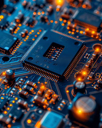 A detailed view of electronic components on a circuit board, illuminated by vibrant bokeh lights that evoke innovation and technological brilliance.