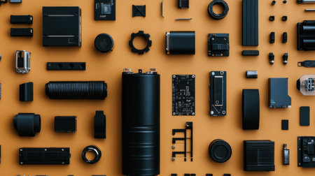 A visually striking flat lay image showcasing an array of industrial components in vibrant orange and black colors set against a dark surface, illustrating technology and design.