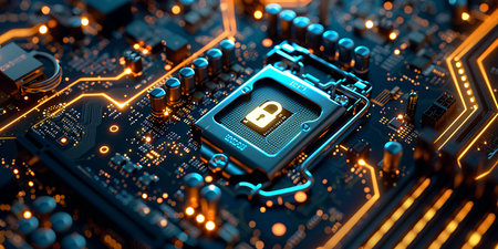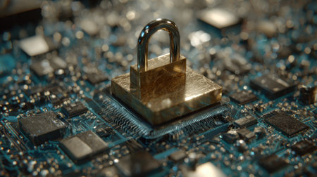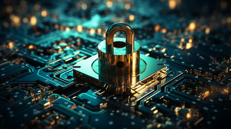 A conceptual image showcasing digital security on a circuit board, featuring a prominent lock symbol. This reflects the importance of data protection and encryption in modern technology.