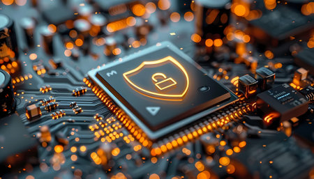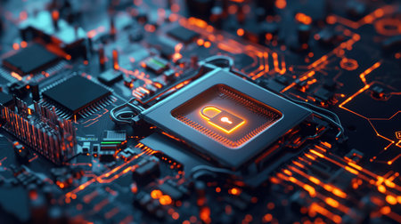 This captivating image features a close-up of a microprocessor chip set against a background of intricate circuitry. The glowing orange lighting represents modern technology and its emphasis on security. The futuristic aesthetic invites viewers into an innovative digital world.