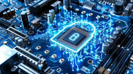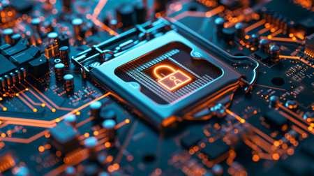 Realistic image of a computer chip with a lock icon on a circuit board for cyber security