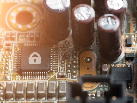 Close-up view of electronic circuit board with padlock icon. Cyber security concept