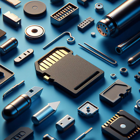 Top view of USB memory cards, SD cards, SD cards and USB flash drive on white background