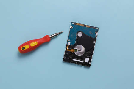 Hard drive with a screwdriver on a blue background. PC repair concept. top view
