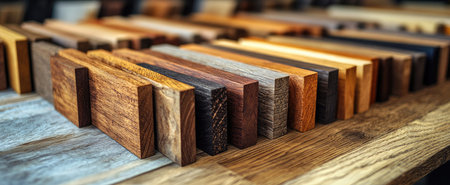 Close-up of multiple rows of different wood flooring samples displayed in an advertising display, showcasing the variety and quality of materials used for home installations. The image has a full depth of field in focus, an f-stop of 8.0, sharp details, and a neutral background. --ar 73:30 --stylize 750 --v 6.1 Job ID: 623995d0-4c66-45f3-9067-bd0dda5f647e