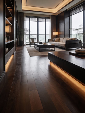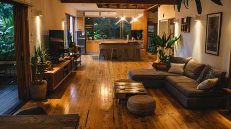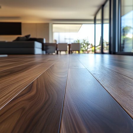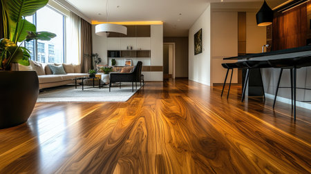 Luxurious wooden floor in a modern open-plan kitchen and living space, exuding warmth and elegance