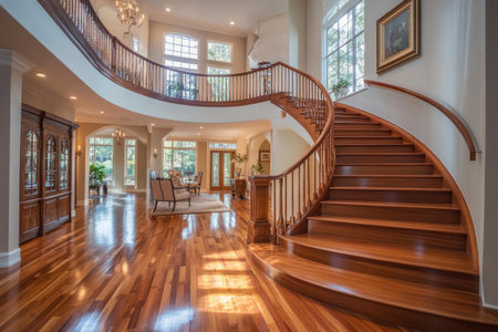 Beautifully designed multi-level home interior with a large, curved staircase and beautiful wood floors. --ar 3:2 --v 6.1 Job ID: db4ee8b3-d10c-41f4-8d76-e6ac145e3bf4