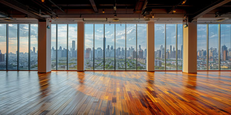 An empty room with a view of a city. Modern dance studio interior