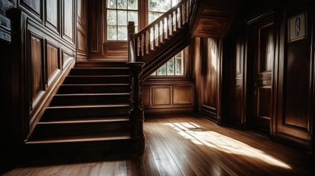 A stunning wooden staircase bathed in natural light, showcasing classic architecture and elegant design in a warm interior space perfect for a vintage home setting.