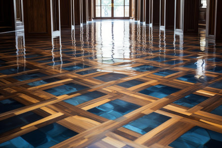 Reflective polished parquet flooring with a geometric pattern in a luxurious interior