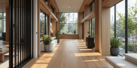 A sleek, contemporary room illuminated by abundant sunlight, showcasing expansive glass walls that reveal a vibrant cityscape, complemented by warm wooden floors.