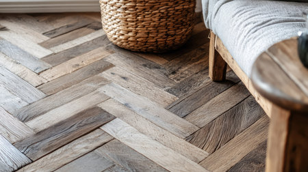 Close-up of weathered parquet flooring in a rustic farmhouse interior, styled with natural wood furniture