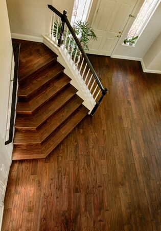 modern wooden staircase and hardwood floor, brown hardwood
