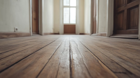 Worn wooden floorboards create a rustic atmosphere in a sunlit room interior