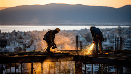 Workers welding on a high-rise construction site with cityscape and sunset in the background