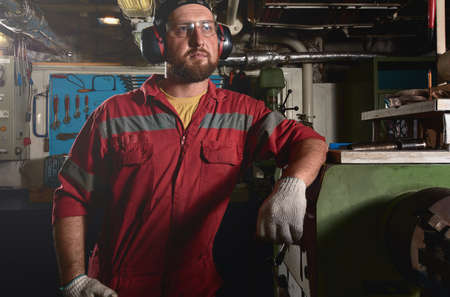Worker in red uniform operating in manual lathe in metal big workshop with dark environment.