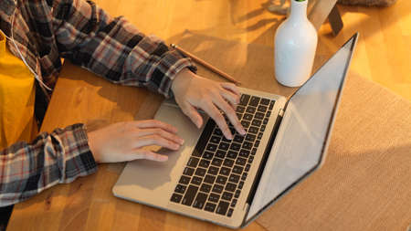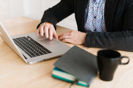 Close-up of a man working at a laptop sitting at a desk. The diary is on the table. Work at the desk at home.