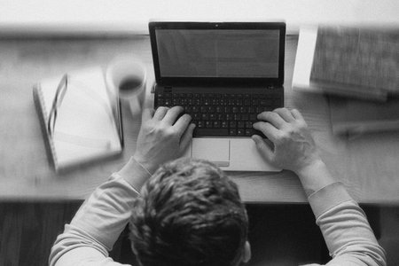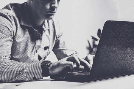 Top view image of young employee typing on laptop. Business projects. Work communication. Black and white effect