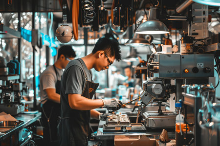 Asian men work in a large factory, where the activity of other workers can be seen against the background of glass windows.