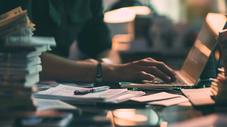 A close-up of a person working on a laptop, surrounded by stacks of documents and papers, symbolizing focus, productivity, and office work.