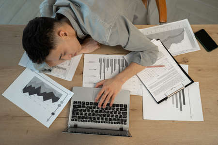Young Asian man sleeps at workplace putting hand on laptop