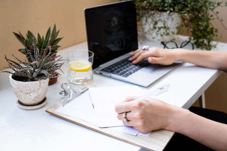 Womans hands on laptop keyboard, writing in notepad