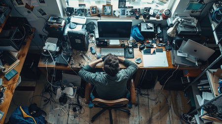 A dynamic and cluttered work desk capturing the essence of a creative mind at work amidst organized chaos.