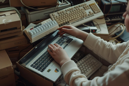 Womans hands packing old laptop and keyboard for e-waste recycling - eco-friendly concept