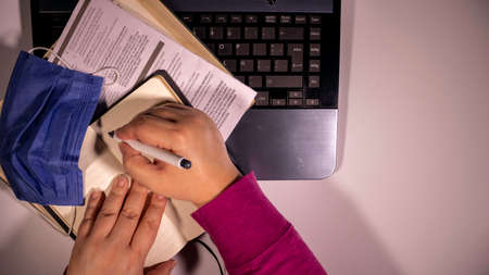 latin man typing on laptop computer on his white desk and taking notes in his diary with a red pen, top view, shot from above, model not recognizable.