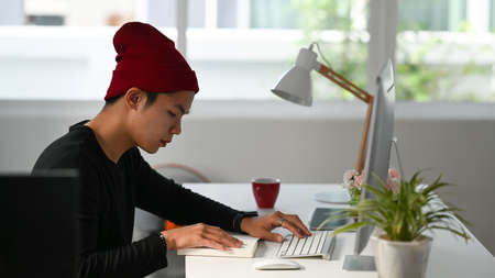 Side view of freelance graphic designer sitting at his workspace and looking at notebook while working on computer.